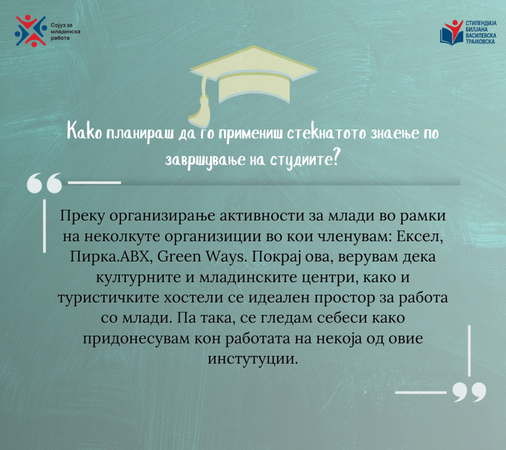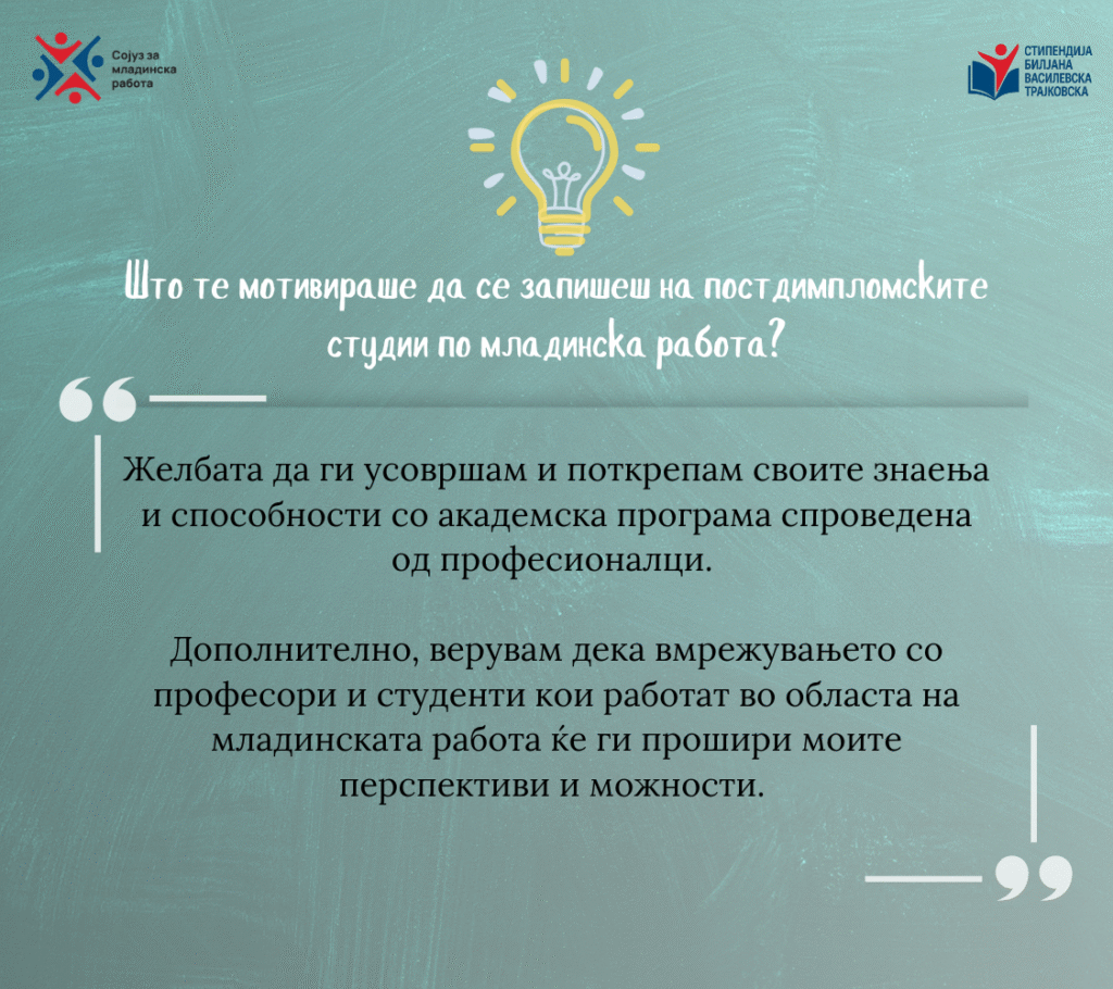 Со Стефан разговаравме за неговите лични мотиви да продолжи со постдипломски студии по младинска работа, за искуствата што го обликувале како младински активист, но и за идните планови и професионални насоки кои ги гледа пред себе.
